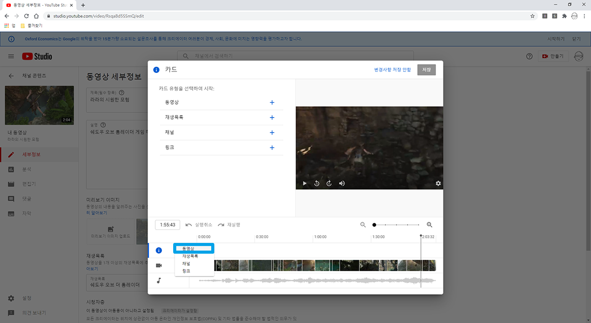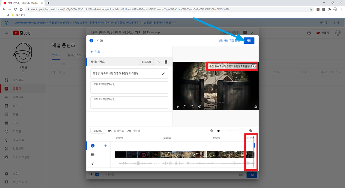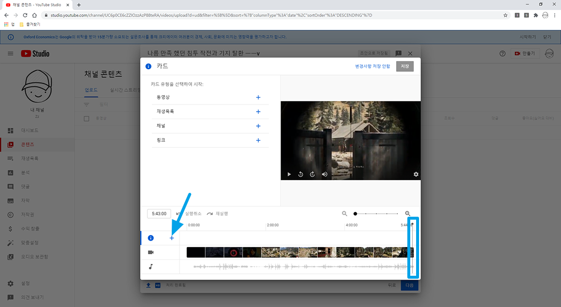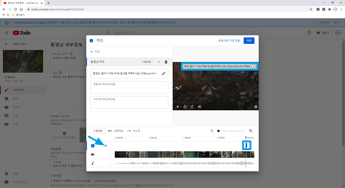 먼저 추천 동영상 카드가 나오는 시간을 선택하셔야 합니다. 오른쪽 하단에 동영상 시간을 지정할 수 있는 바를 마우스로 끌어 원하는 시간대를 먼저 지정하시면 됩니다.
