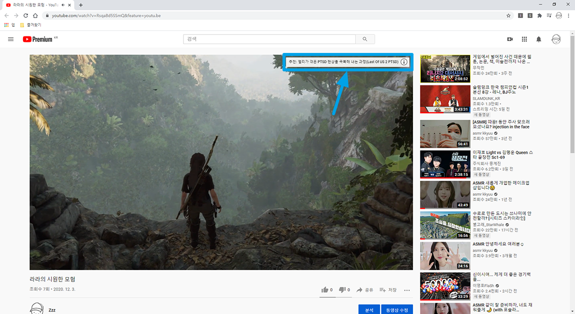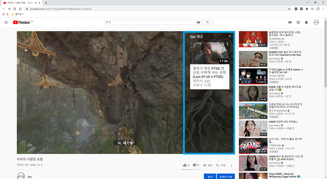 추천 동영상 카드를 추가한 후 유튜브 동영상을 재생해 보니 추천 동영상 카드가 잘 적용된 것을 확인할 수 있었습니다.