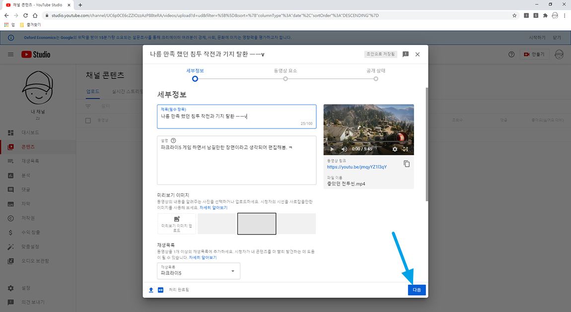 유튜브 채널에 동영상을 업로드 후 바로 추천 카드를 바로 적용하시려면 아래 이미지와 같이 업로드 동영상 진행 중 다음 버튼 선택.
