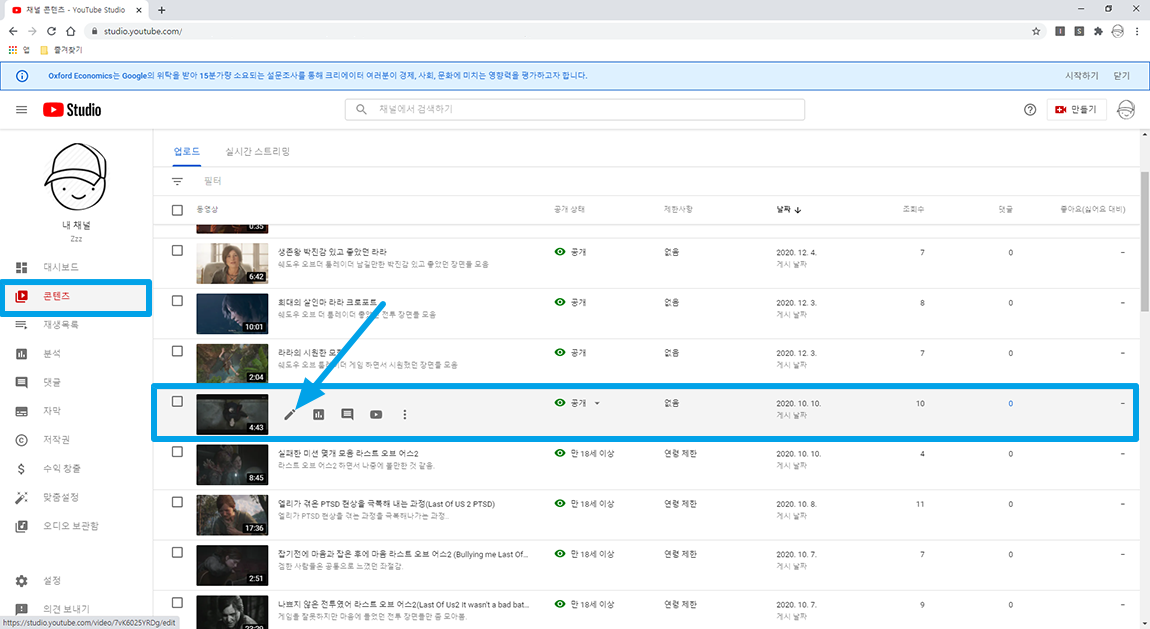 동영상 업로드 진행 중 동영상 추천 카드를 추가하지 않으셨다면 기존에 유튜브에 업로드한 동영상 목록을 통해서도 추가하실 수 있습니다. 다시 왼쪽 메뉴 중 콘텐츠 메뉴 선택하시고 유튜브 추천 동영상 카드를 추가하기 위한 동영상을 마우스로 이동하게 되면 추가 메뉴가 나옵니다. 이곳에서 연필 모양의 아이콘을 선택하시면 됩니다.