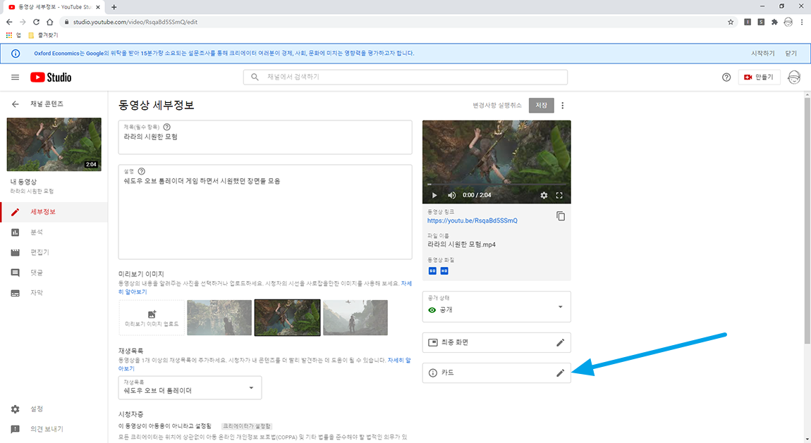 저와 비슷한 이유와 취미로 하시는 분들이 많으실 텐데 유튜브 기능 중 하나인 카드 섹션 추가하는 방법에 대해 정리해 보았으니 필요하신 분들께 도움이 되었길 바랍니다.