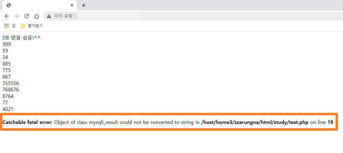 아래 이미지와 같이 발생하는 에러 로그는 여러 가지 상황에서 에러가 발생할 수 있습니다. 하지만 소스 구문 중 SELECT 쿼리 실행 결과를 확인하기 위해 mysqli_num_rows를 사용하지 않고 echo를 사용해 쿼리 실행 결과를 바로 출력하려고 했을 때 발생하기도 합니다.