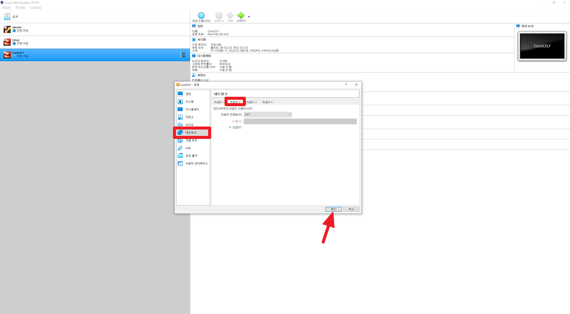네트워크 어댑터2 메뉴 선택 후 NAT 선택 후 확인 버튼.