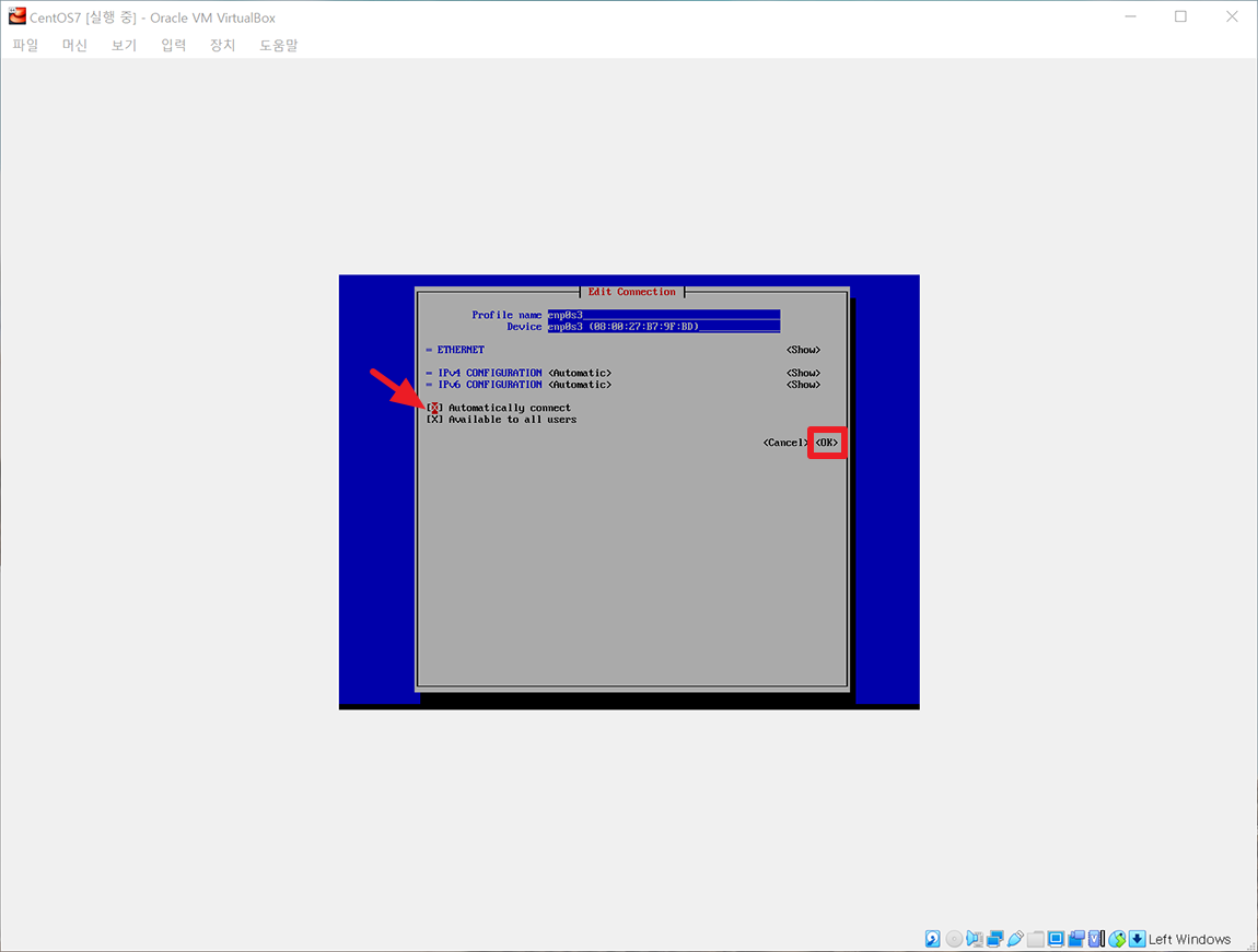 키보드 방향키를 이용해 automatically connect 메뉴에서 스페이스바를 누르시면 X 표시가 활성화됩니다. 자동 연결을 활성화하셨으니 OK 버튼 선택하시면 됩니다.
