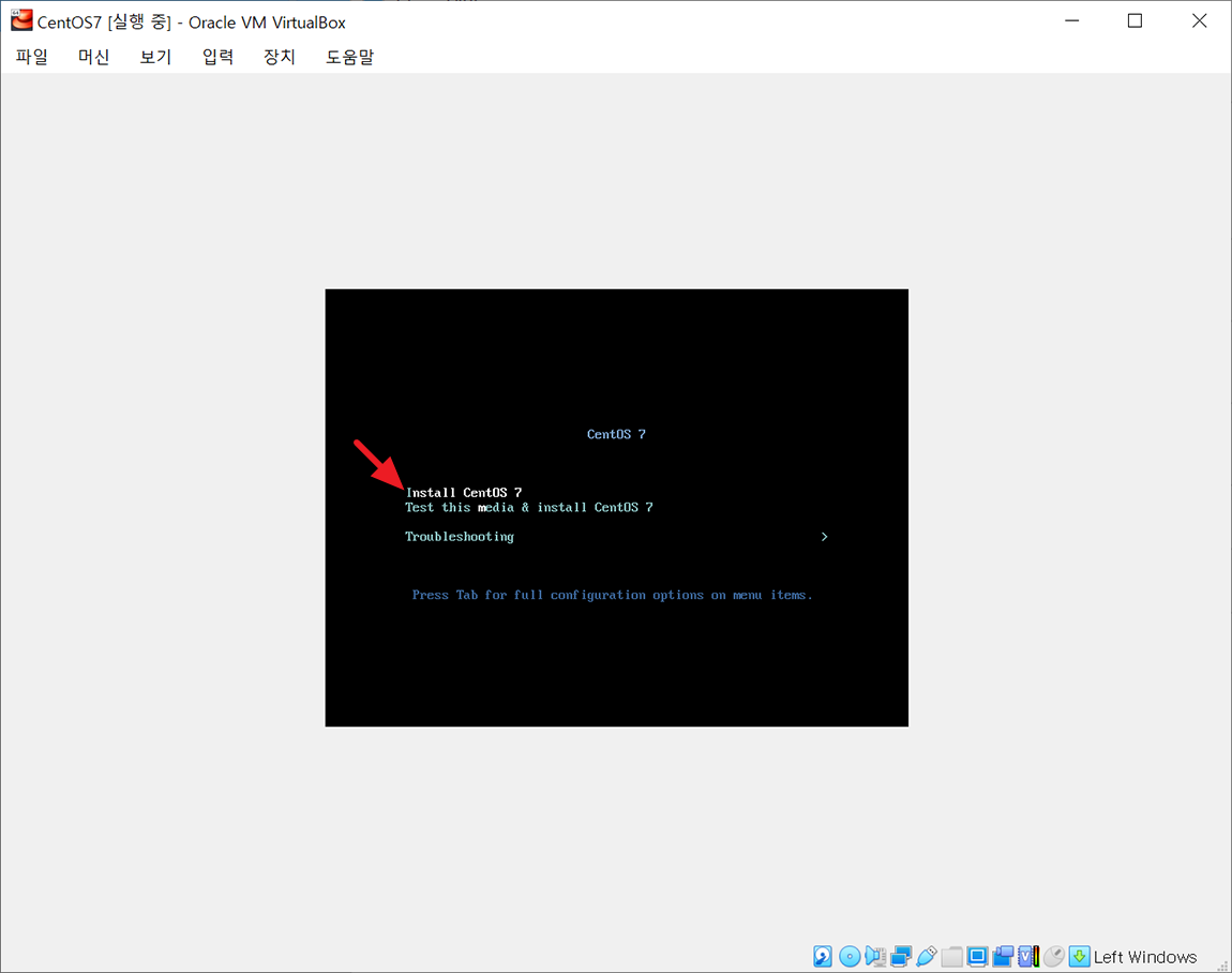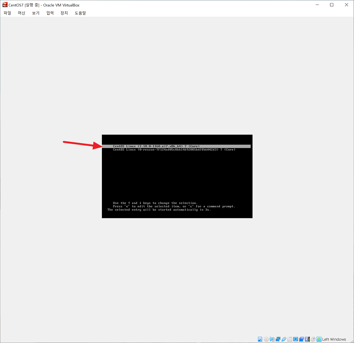 가상 머신에서 방향키를 이용해 Install CentOS 7 선택 후 엔터.