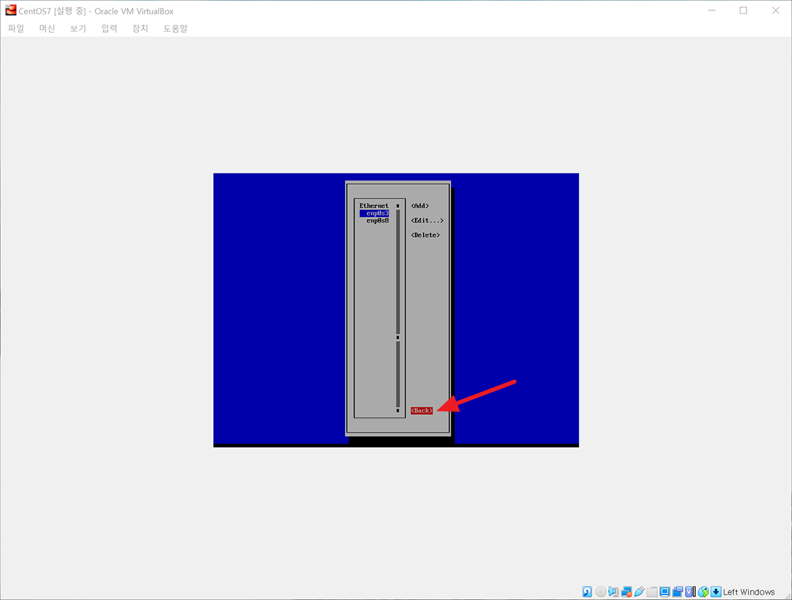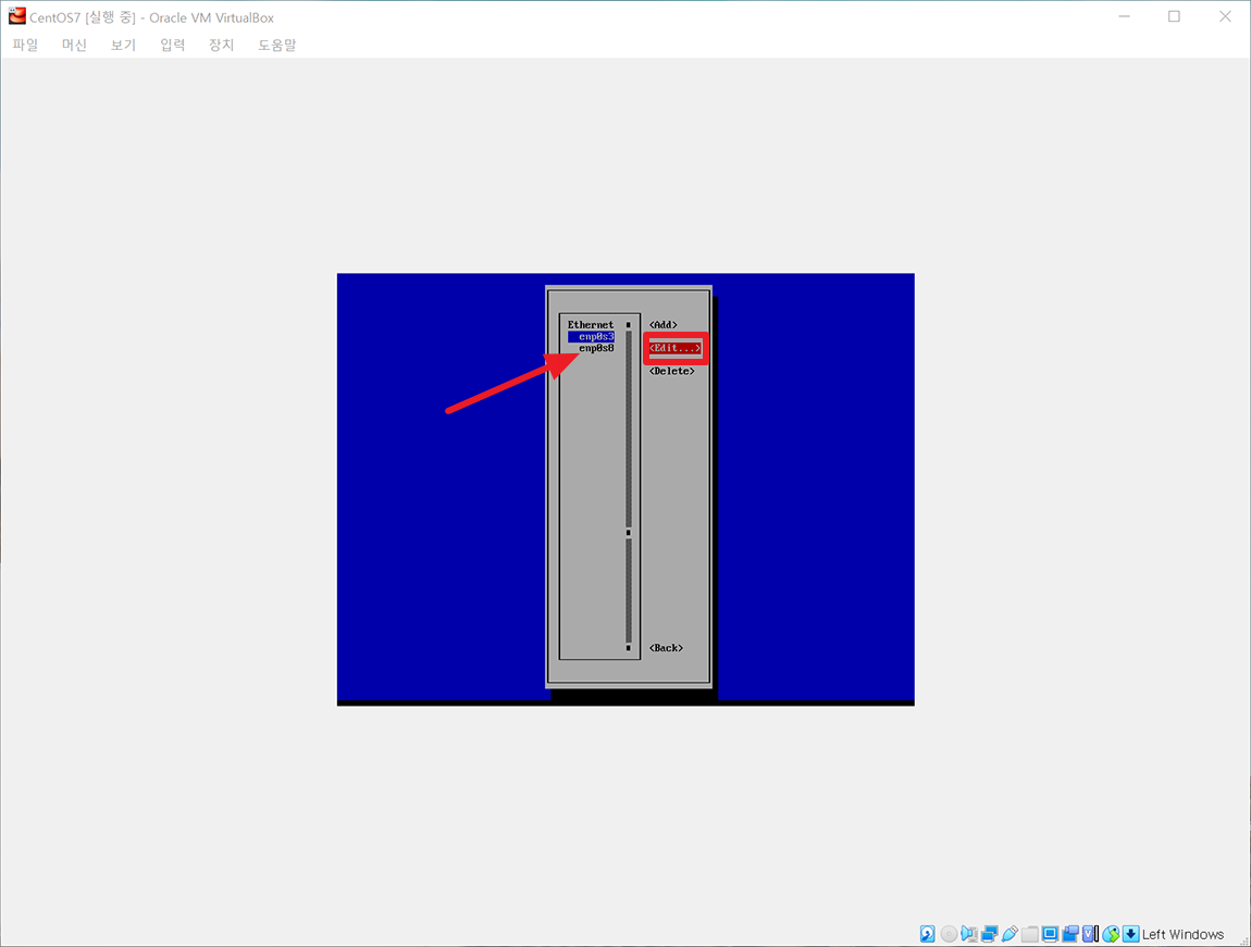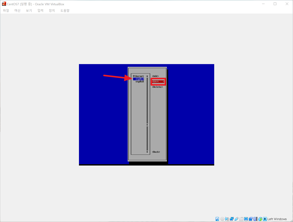 VirtualBox 네트워크 설정에서 설정했었던 네트워크가 2 가지 표시 됩니다. 먼저 첫번째 네트워크 선택 후 엔터. edit 선택 엔터.