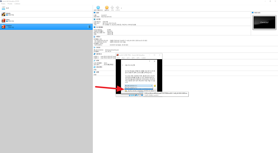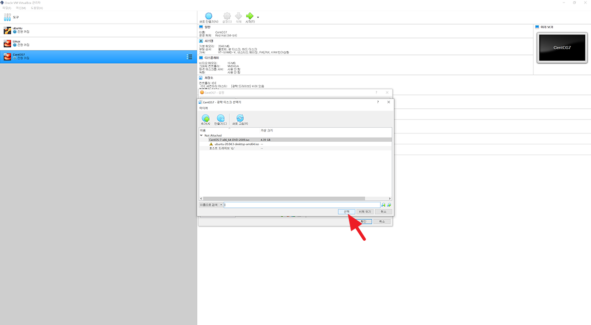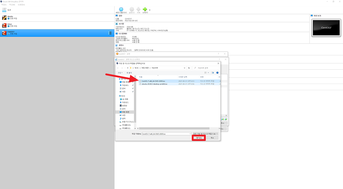 인터넷에서 받았던 CentOS-7-x86_64-DVD-2009.iso 파일 선택 후 열기.