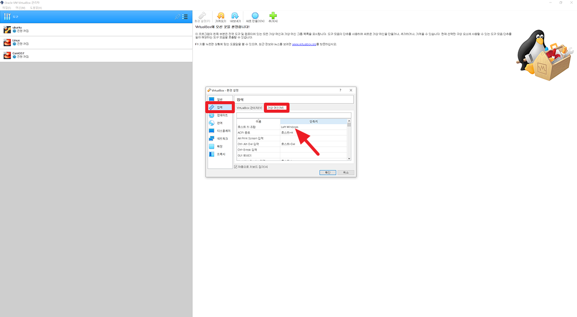 파일 → 환경설정 → 입력 → 가상 머신 메뉴 탭 선택 후 호스트키 조합을 Right Shift에서 Left Windows키로 변경했습니다. 윈도우키는 윈도우10 환경에서 자주 사용하던 키라 개인적으로 더 편한 것 같습니다.