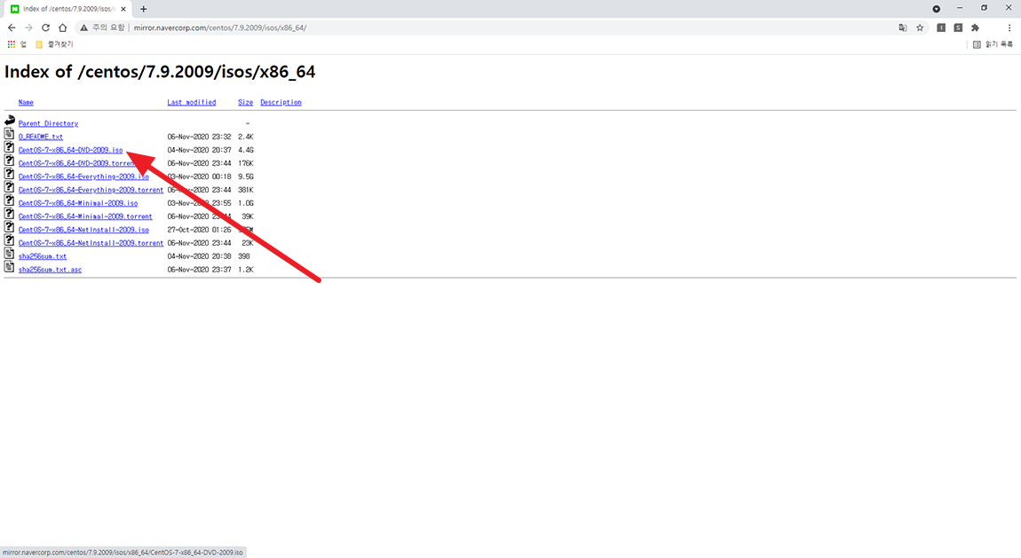 이곳에서 CentOS-7-x86_64-DVD-2009.iso 링크를 선택하시면 다운로드가 시작됩니다. 정상적으로 다운로드 되지 않거나 다운로드 경로를 못찾으셨다면 http://mirror.navercorp.com/centos/7.9.2009/isos/x86_64/CentOS-7-x86_64-DVD-2009.iso 이경로를 인터넷 주소창에 붙여 넣어 엔터를 누르시면 사이트에 하나씩 접근하지 않아도 ISO 파일이 다운로드 되니 참고 하시면 좋을 것 같습니다.