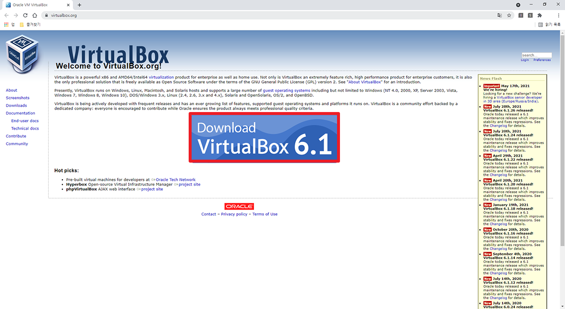 CentOS 7 운영체제 파일을 다운로드받았으니 이제 가상머신 프로그램을 설치해 주시면 됩니다. VirtualBox를 설치하려면 https://www.virtualbox.org/ 사이트 접속 후 Download VirtualBox 6.1 버튼을 선택해 주시면 됩니다. 마찬가지로 시간이 지나 사이트 화면이 바뀔 가능성이 있습니다.