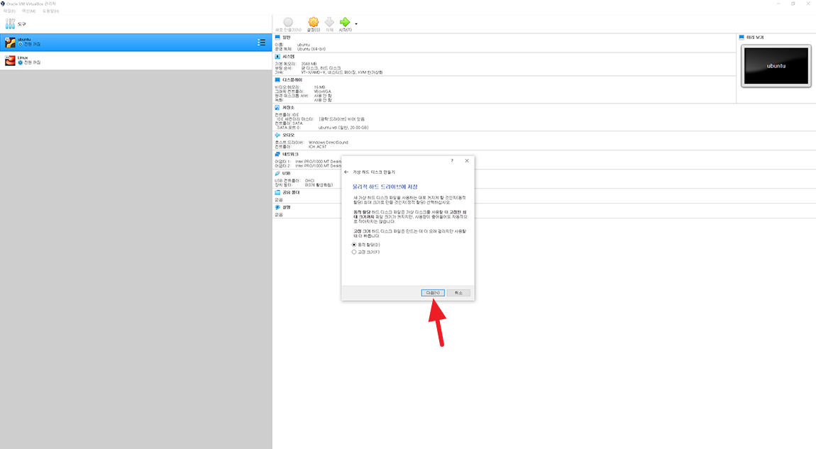 물리적 하드 드라이브에 저장은 동적 할당 선택 후 다음.