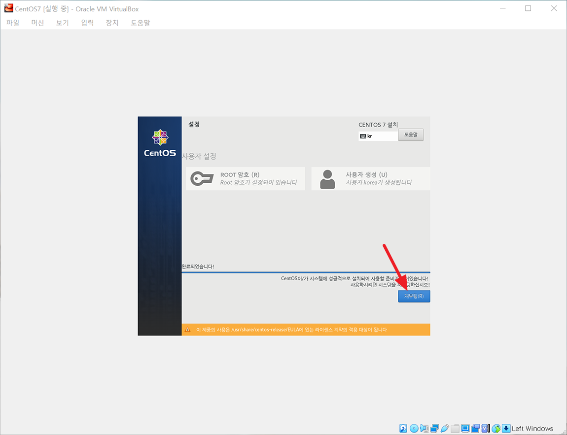 모든 설치가 완료되면 오른쪽 하단에 재부팅 메뉴가 나옵니다. 재부팅 선택.