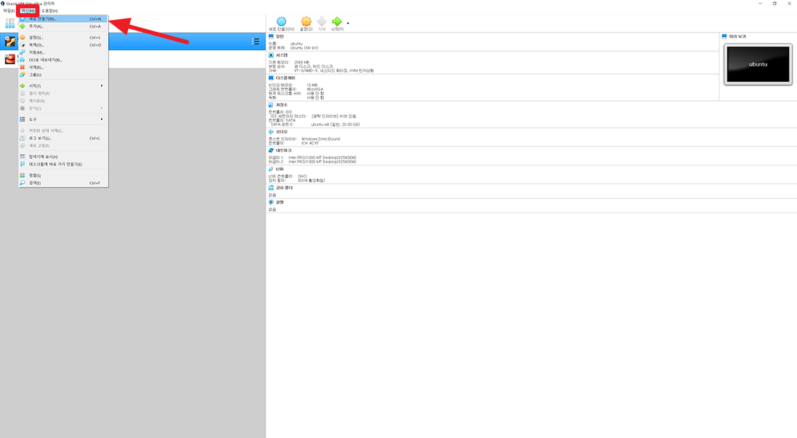 VirtualBox 프로그램을 실행 후 머신 메뉴 새로 만들기 메뉴를 선택 하시면 됩니다.