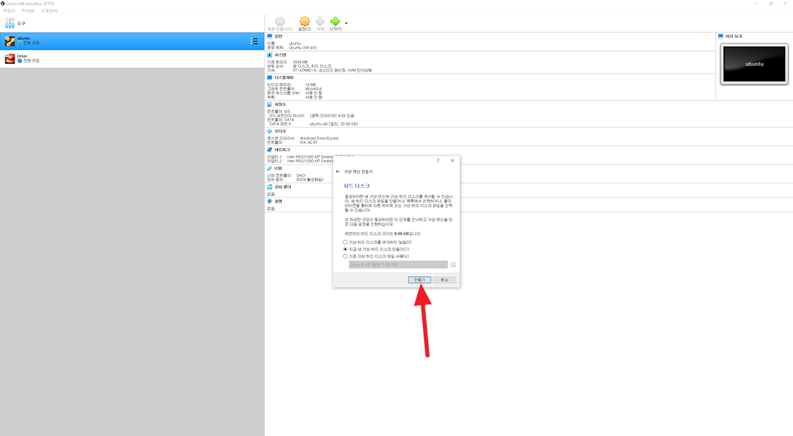 파일 위치 및 크기는 기본 폴더를 그대로 사용하였으며 30.0GB 지정 후 만들기 선택.