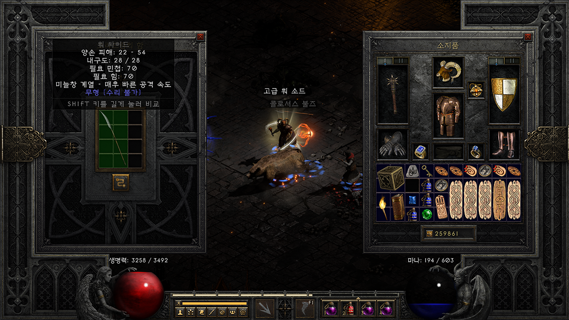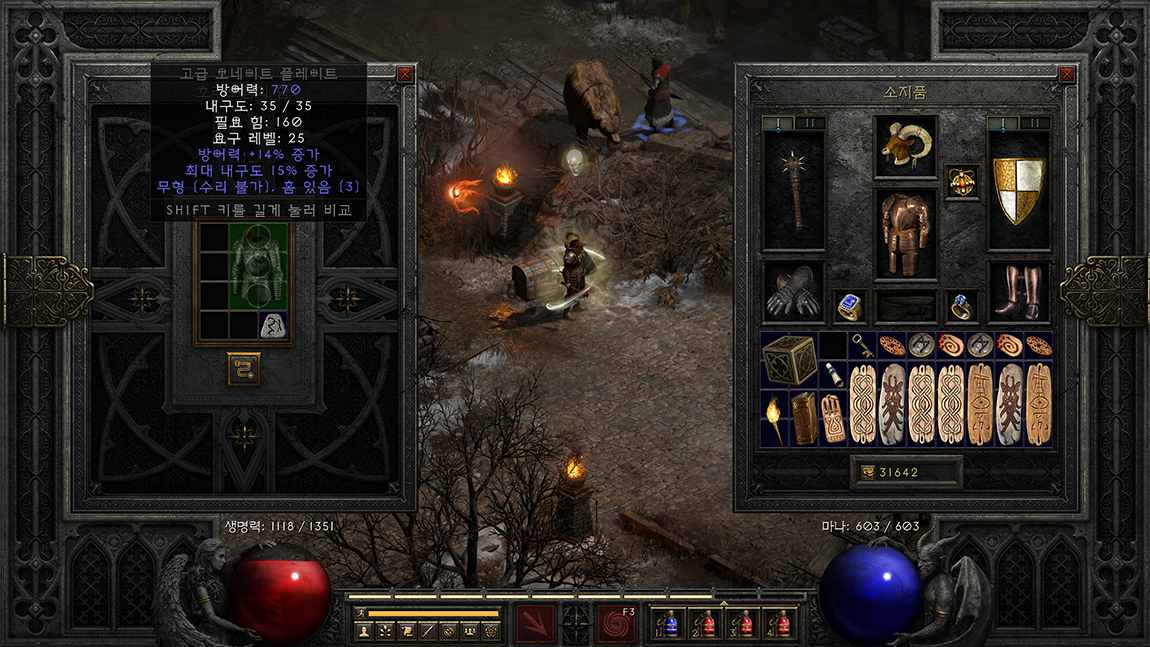 디아블로2 레저렉션 게임을 하면서 이미 많이 알고 있으실만한 내용이라 작성하지 않을까 했는데 시간이 지나 제가 플레이했던 장면도 남길 겸 해서 정리해 봤습니다. 그나저나 블리자드 분들은 유저들이 그토록 원하던 인벤토리 공간, 창고 공간, 아이템 자동 정리 기능만 넣어줘도 괜찮은 업데이트라 생각되는데 블리자드 개발자분들도 저와 같이 오리지널을 좋아하나 봅니다. 공유창고도 없었던 시절에 비교하면 그나마 보관할 공간이 추가되어 있어 다행이라는 생각도 듭니다.
