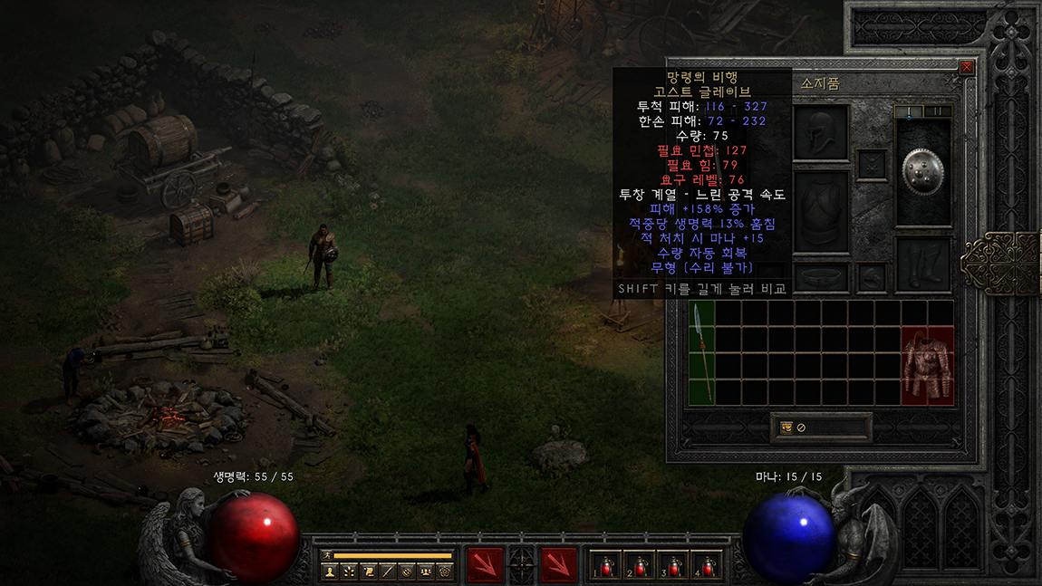 디아블로2 레저렉션 게임을 늦게 시작하시는 분들도 있을 수 있으니 대부분 알고 계시는 내용이겠지만 그래도 한번 정리해 봅니다. 디아블로2 게임을 하다 보면 아이템 하나 넣을 칸도 부족해지는데 수많은 레어, 유니크, 매직 아이템 중 수리가 불가능한 에테리얼 아이템은 가치도 있고 수집을 목표로 하시는 분들이 있다면 아이템을 소지품창에서 확인하지 않아도 에테리얼 아이템인 확인하실 수 있으니 참고 하시면 좋을 것 같습니다.
