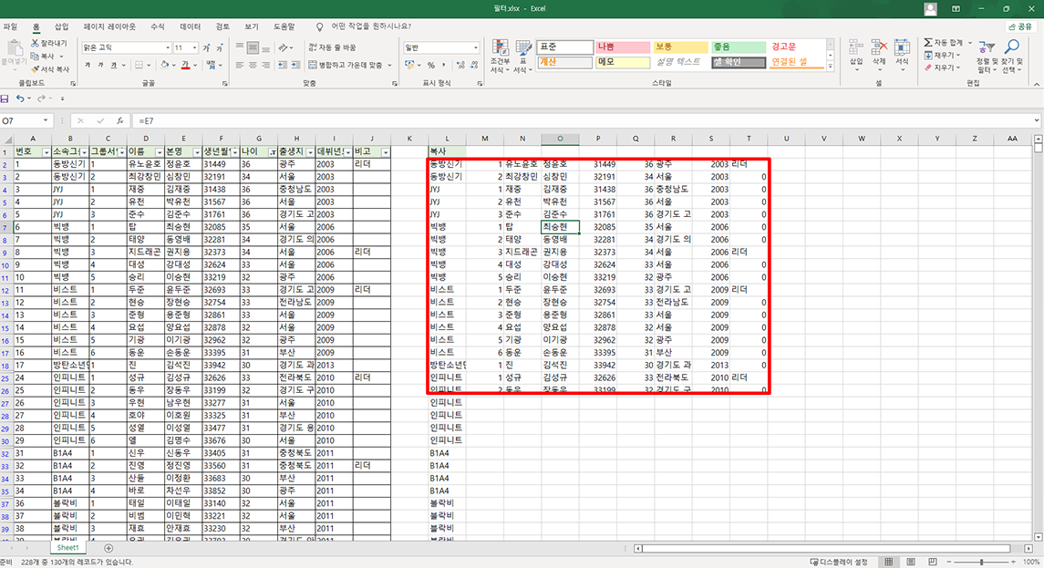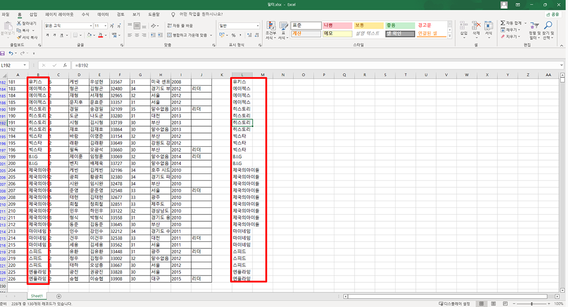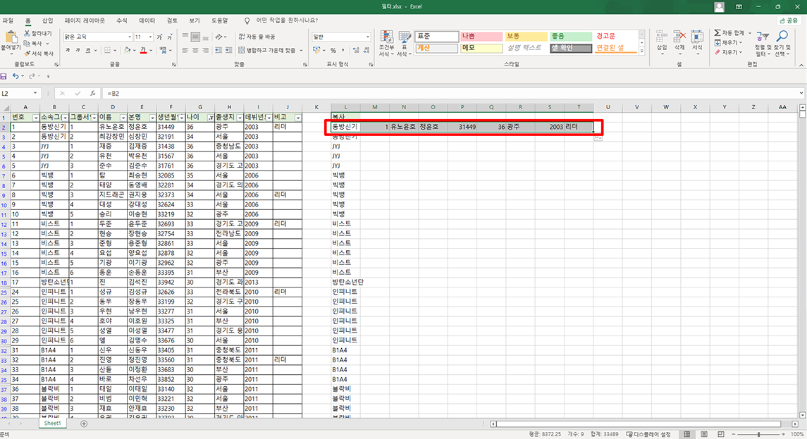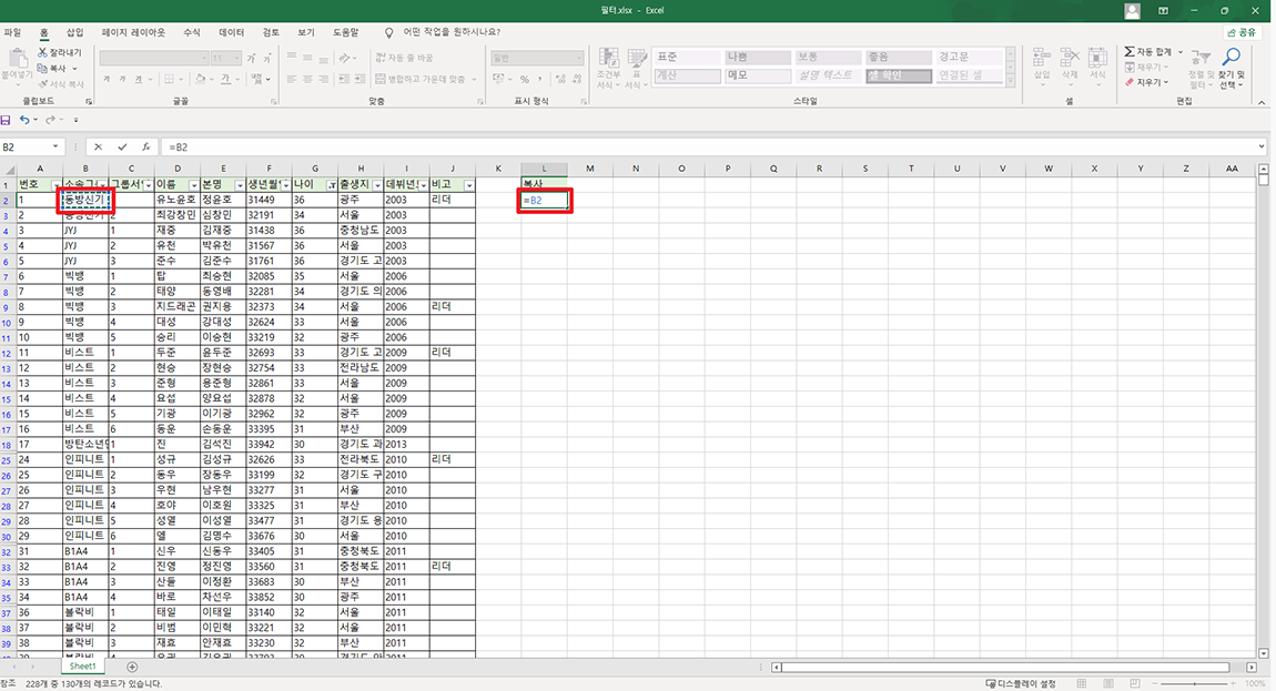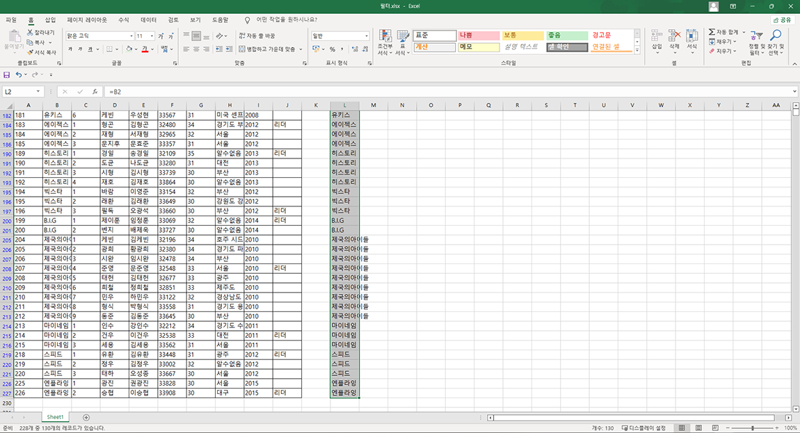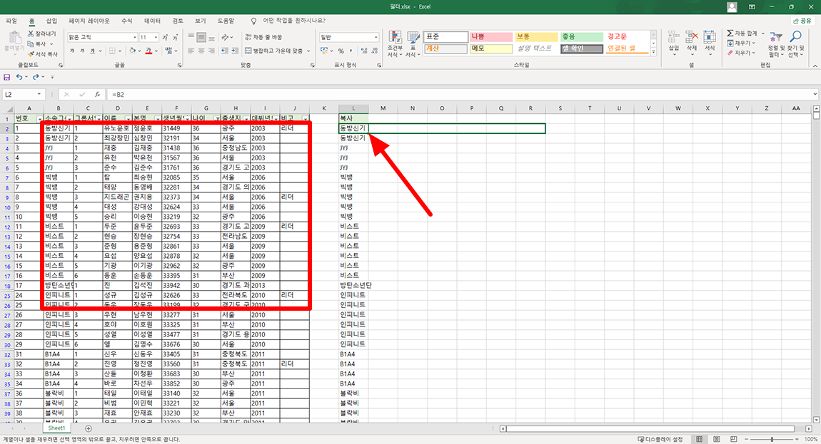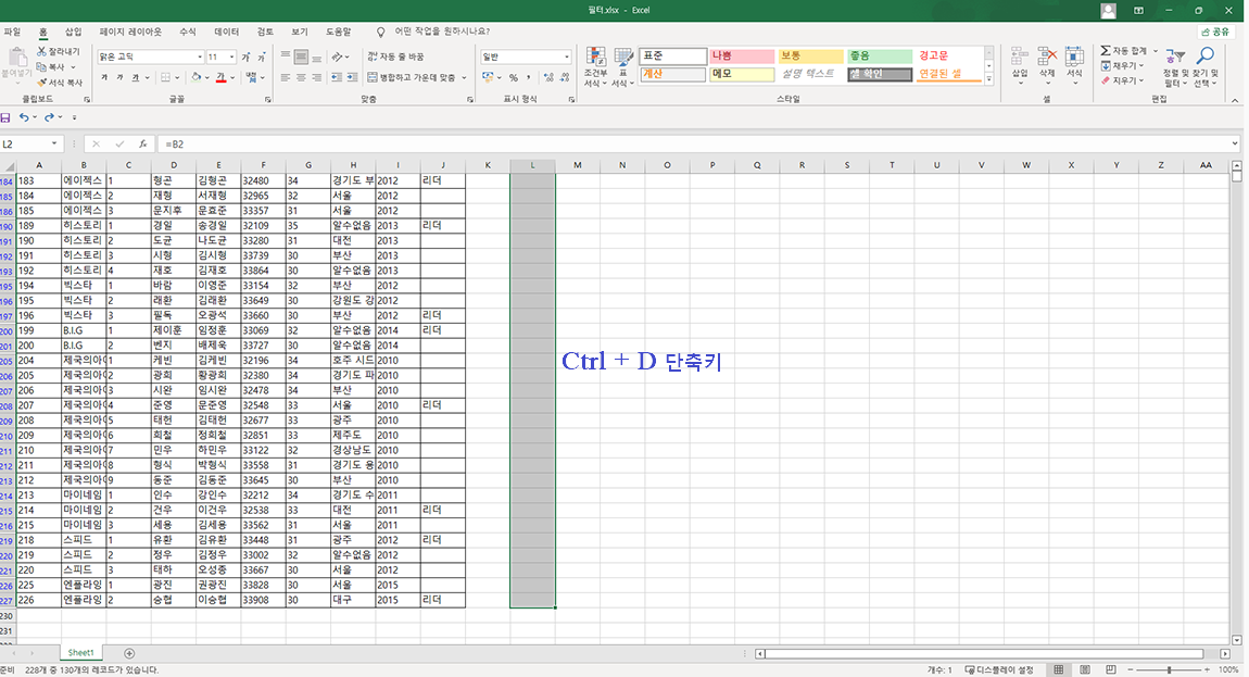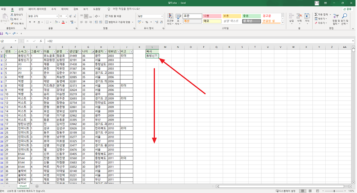 마지막으로 필터가 걸려 있는 여러 영역에 데이터를 가져오고 싶으시다면 L2 영역의 오른쪽 하단 끝 영역을 마우스로 잡고 오른쪽으로 복사하시면 됩니다.