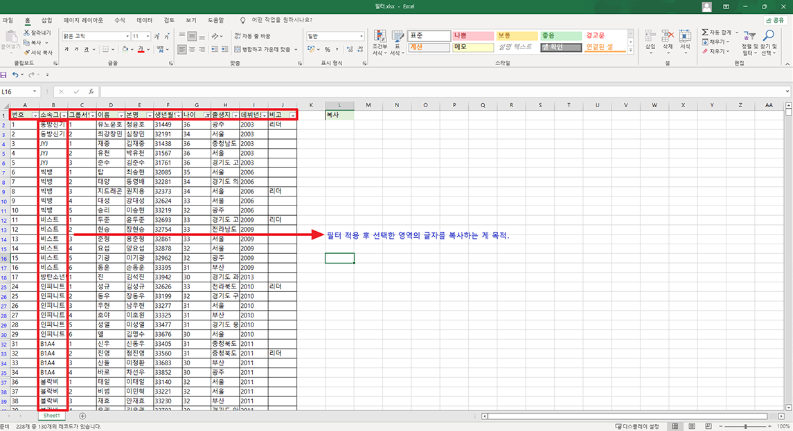 필터가 적용된 데이터 중 원하는 글자를 복사하여 활용하고 싶다면 복사할 영역에서 가져올 글자의 첫 번째 셀을 선택하시면 됩니다.