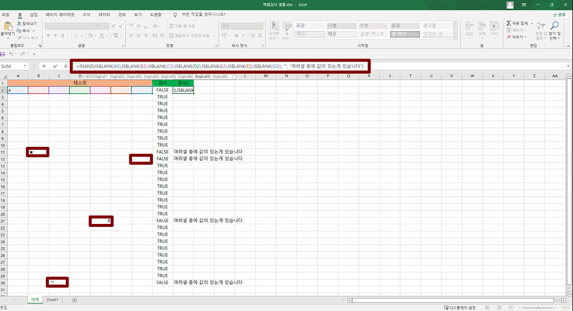전체수식 =IF(AND(ISBLANK(A2),ISBLANK(B2),ISBLANK(C2),ISBLANK(D2),ISBLANK(E2),ISBLANK(F2),ISBLANK(G2)), "", "여러셀 중에 값이 있는게 있습니다")