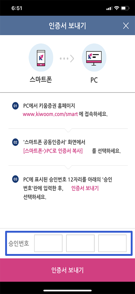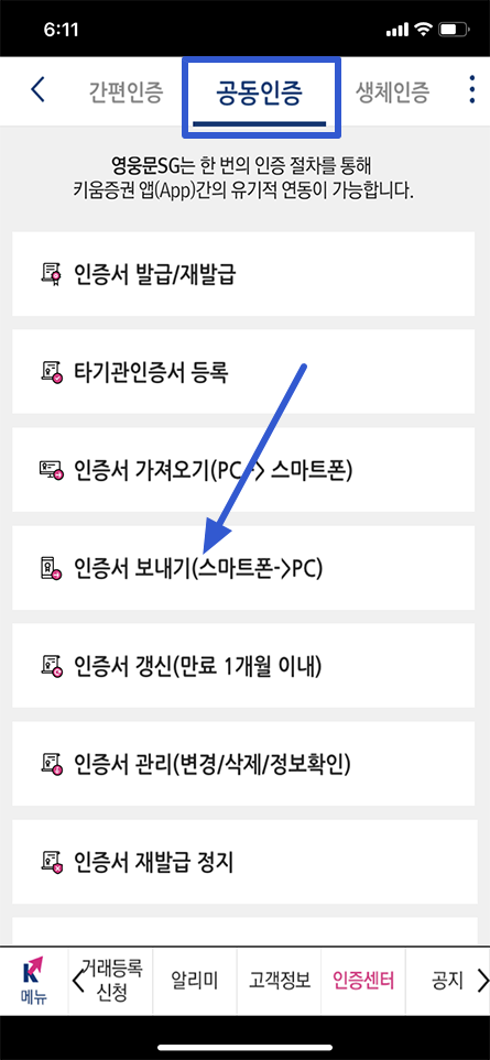 다시 핸드폰 키움증권S 글로벌 앱 → 업무 → 인증센터 → 공동인증 메뉴에 인증서 보내기(스마트폰->)PC 메뉴를 선택하시면 됩니다.