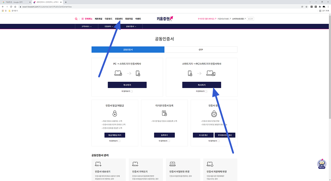 PC 인터넷 환경에서 키움증권 사이트에 접속하시고 인증센터 메뉴에서 스마트기기에서 PC로 인증서를 복사하는 메뉴를 선택하시면 됩니다.