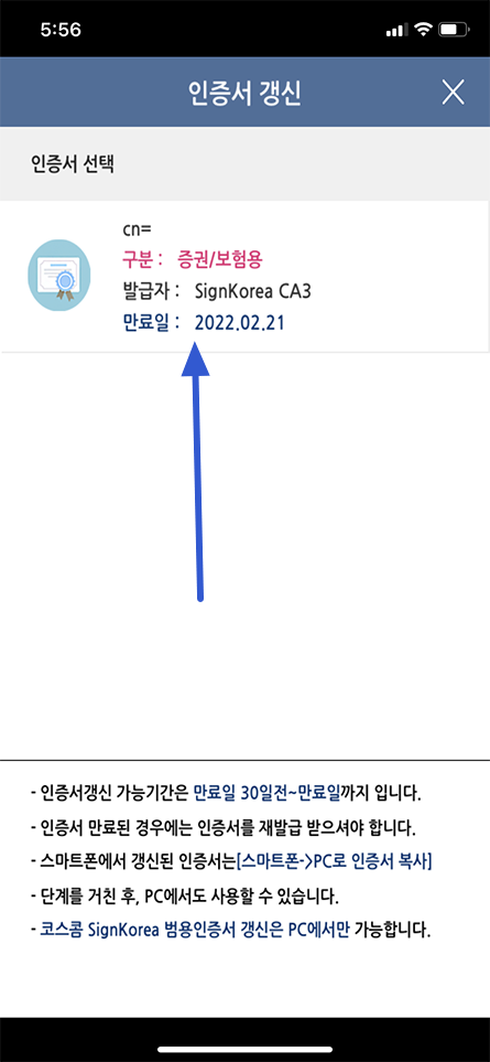 PC 인터넷 환경에서 확인해 보니 인증서가 2022년까지로 자동으로 갱신되지 않았습니다. 그렇기에 핸드폰에서 갱신한 인증서를 다시 PC로 가져와야 합니다.