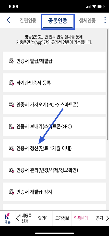 자주 사용하시는 기기에서 인증서를 갱신하셔야 합니다. 그렇지 않으면 스마트폰에서 인증서 갱신을 하였다고 해도 PC에서 사용하려면 추가로 핸드폰에서 인증서를 복사하는 과정을 또 거쳐야 하므로 귀찮습니다. 어쨌든 저는 자주 사용하는 영웅문S 글로벌(해외 주식 거래용) 앱을 이용해 진행했습니다.