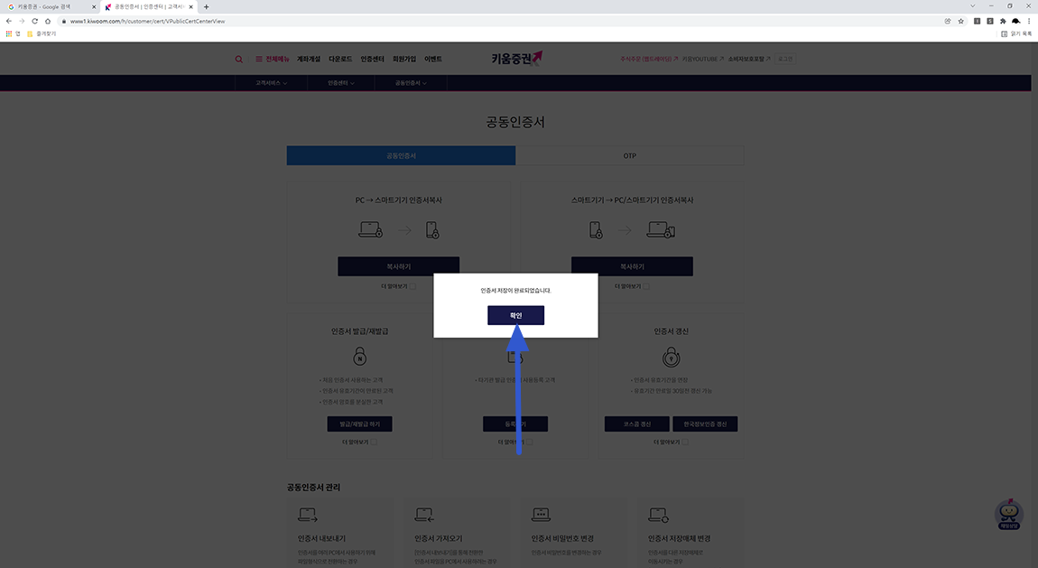 이제 스마트기기에서 12개의 번호를 모두 입력 후 인증서 보내기까지 완료했으니 확인 버튼을 누르시면 됩니다.