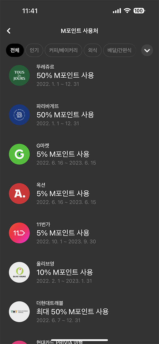 M 포인트 사용처를 보니 사람들이 자주 사용하는 사용처 리스트가 나옵니다. 일부 결제는 제가 원하는 방식이 아니기에 눈으로 보기만 했습니다.