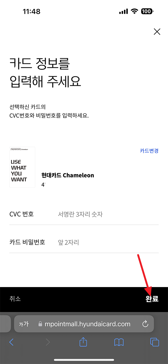 현대카드 앱을 기존에 사용하고 계셨다면 어렵지 않게 터치 몇 번으로 신용카드를 연결하실 수 있습니다만 CVC 번호 때문에 실물 카드를 한번 확인해야 했습니다. 주소 입력부터 카드까지 모두 연결 했으니 완료 버튼을 눌러 결제를 진행했습니다.