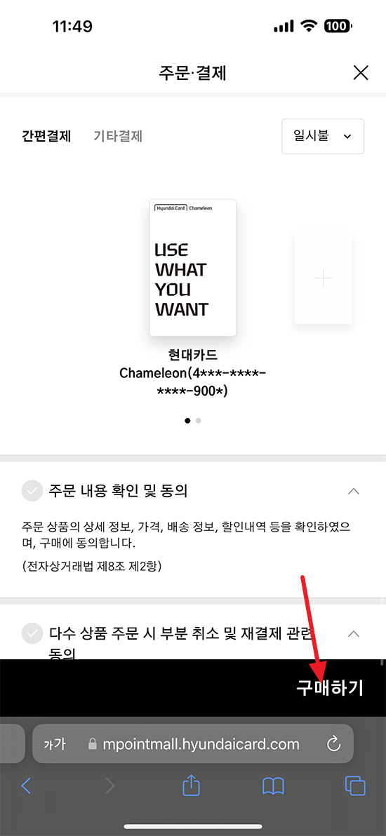 포인트 사용에 체크가 되어 있는지 확인하시고 포인트 사용이 선택된 상태에서 구매하기 버튼을 누르시면 현대카드 포인트가 쌓인 신용카드를 연결하실 수 있습니다.