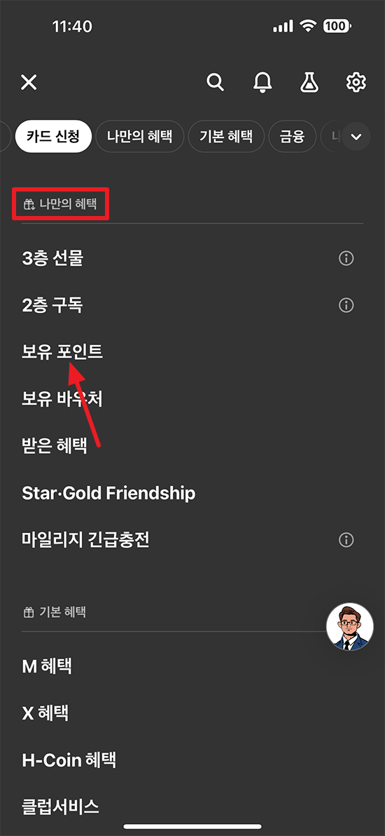 메뉴 중 아래로 스와이프하시다 보면 나만의 혜택 메뉴에 보유 포인트가 메뉴가 있습니다. 보유 포인트 메뉴 선택.