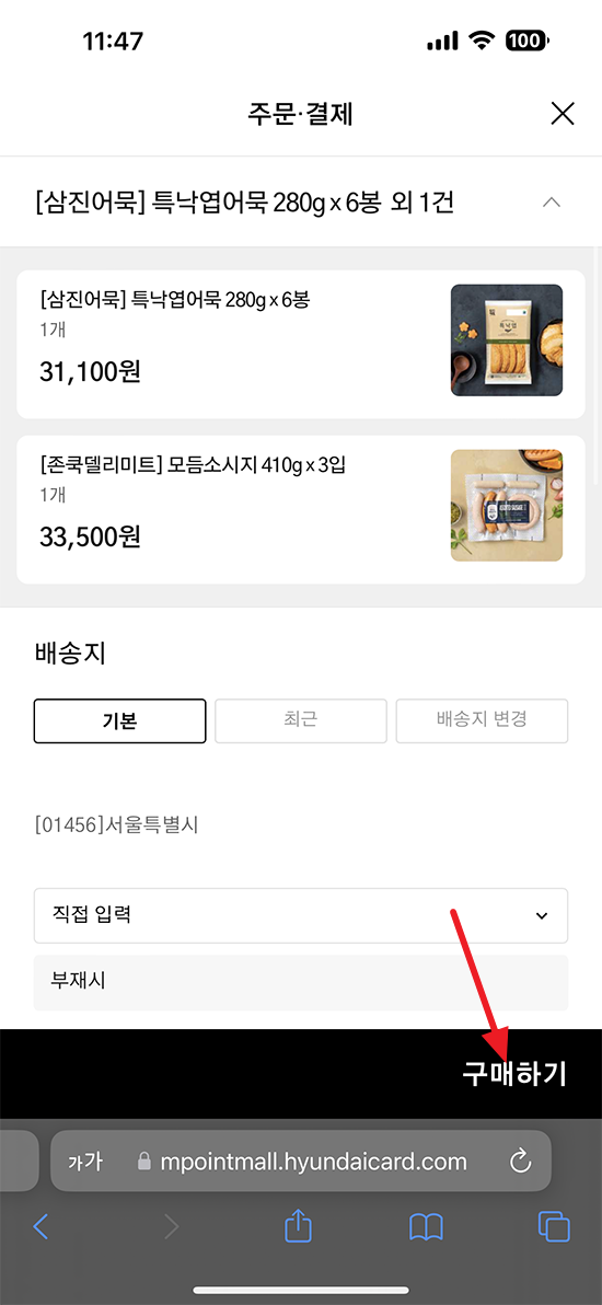 배송지도 모두 새로 입력 하시고 배송지 입력 끝나셨다면 구매하기 버튼 선택.