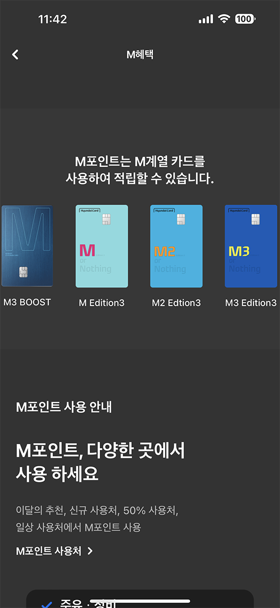 먼저 현대카드 M 포인트는 아래 이미지와 같이 현대카드사의 M 계열 카드를 사용할 때 적립이 가능합니다.