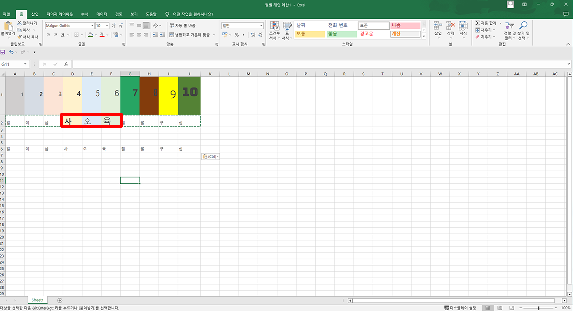 4, 5, 6 영역에 각각 적용된 폰트, 크기, 색깔까지 사오육 영역에 서식이 그대로 적용돼 편합니다. 추가로 셀 서식을 지정하지 않고 서식 복사 기능 하나면 기존 서식을 그대로 쓸 수 있습니다.