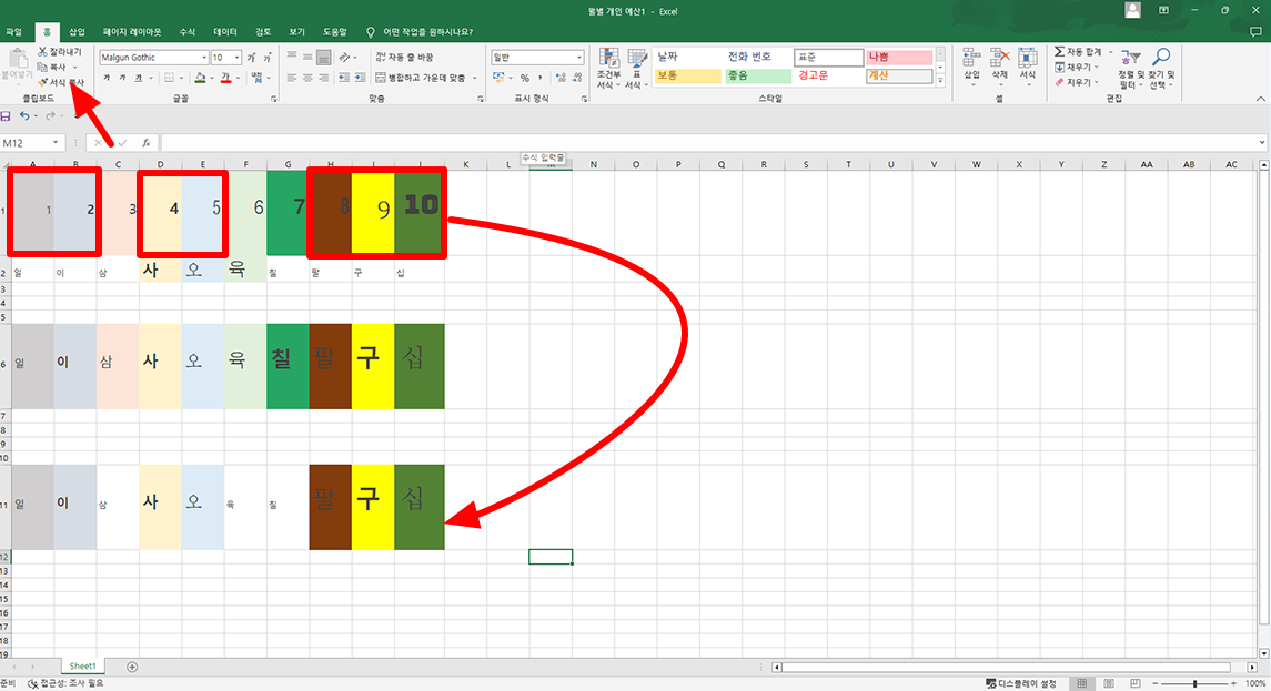 아래 엑셀 숫자 1~10까지 글자 크기, 색상, 폰트, 굵기가 모두 다릅니다. 한글로 일부터 십까지는 서식을 적용할 일반 텍스트 글자입니다. 엑셀에서 서식 복사 기능은 굉장히 유용합니다. 다양한 서식이 적용된 기존 셀 개수만 맞춰주면 기존 서식을 그대로 활용하실 수 있습니다.