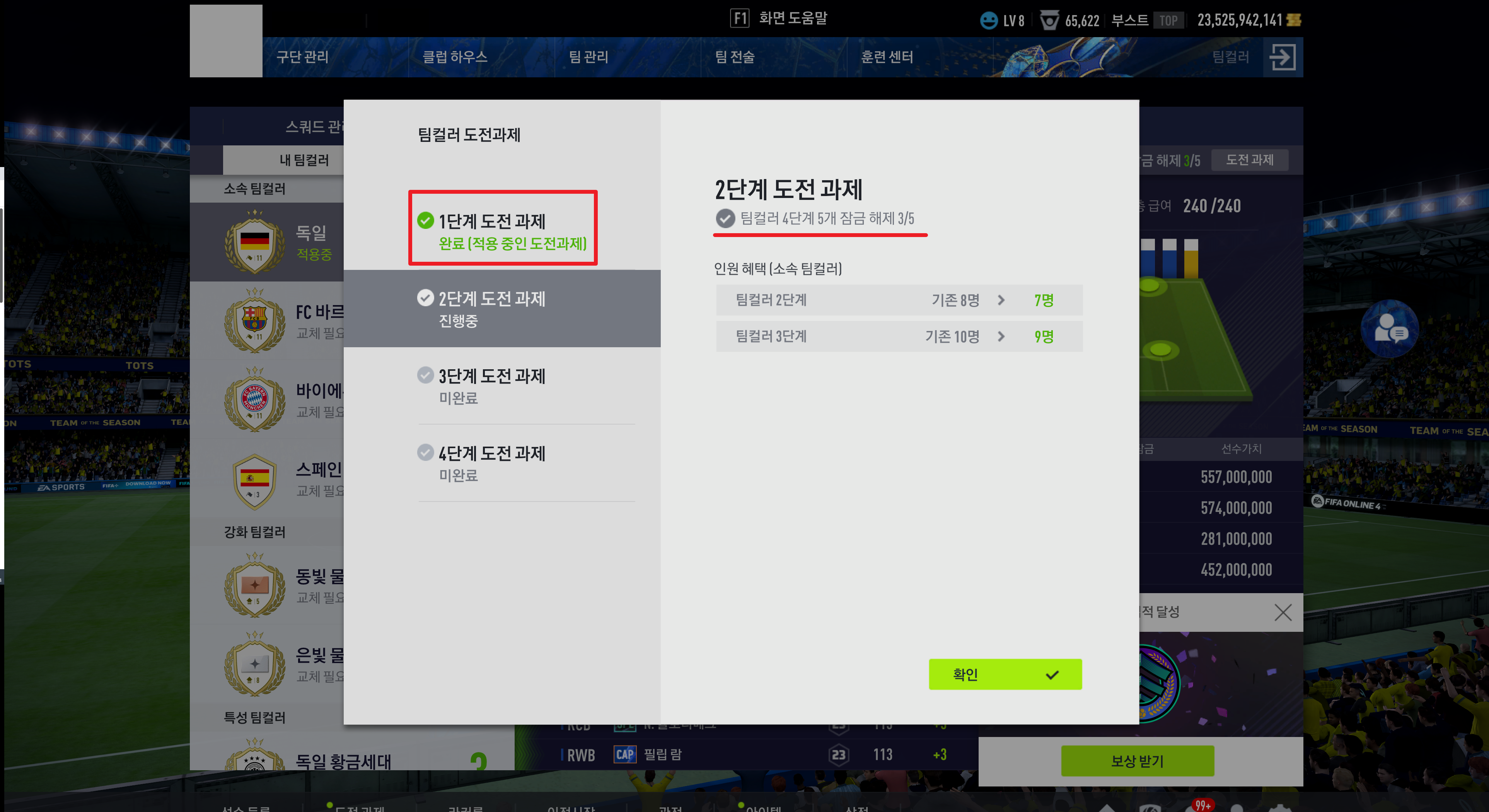 팀컬러 1단계 도전과제 미션을 해결하기 위해 독일 주축으로 진행해 보려고 합니다. 3단계, 4단계 잠금을 해제하려면 전체경기 횟수와 팬 평가 S를 받아야 하는군요. 팀컬러 목록 중 4단계까지 표시안된 팀들도 있습니다. 팀컬러 미션을 깨기 위해서는 4단계까지 표시되어 있는 팀컬러 팀으로 진행하셔야 합니다.