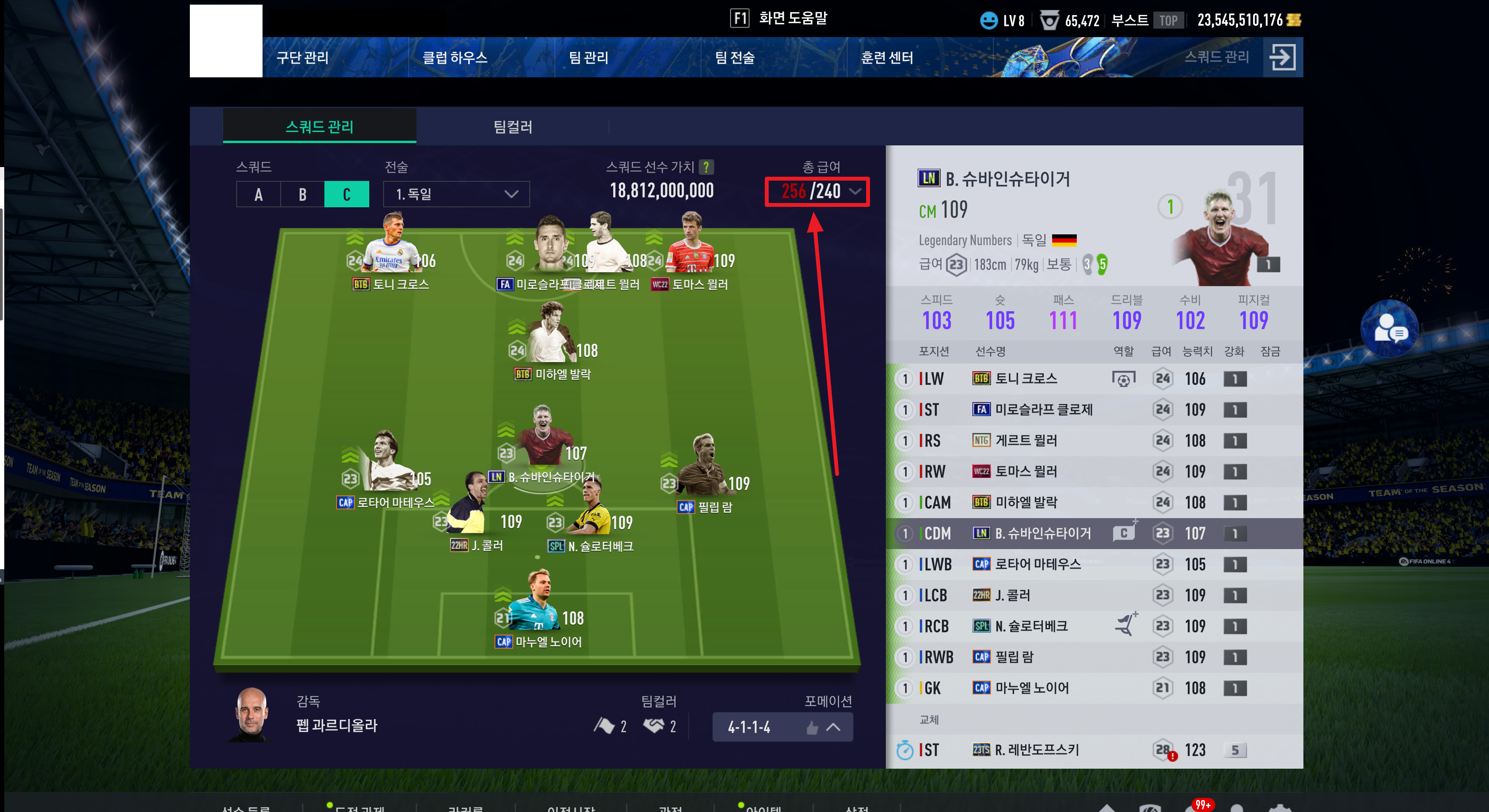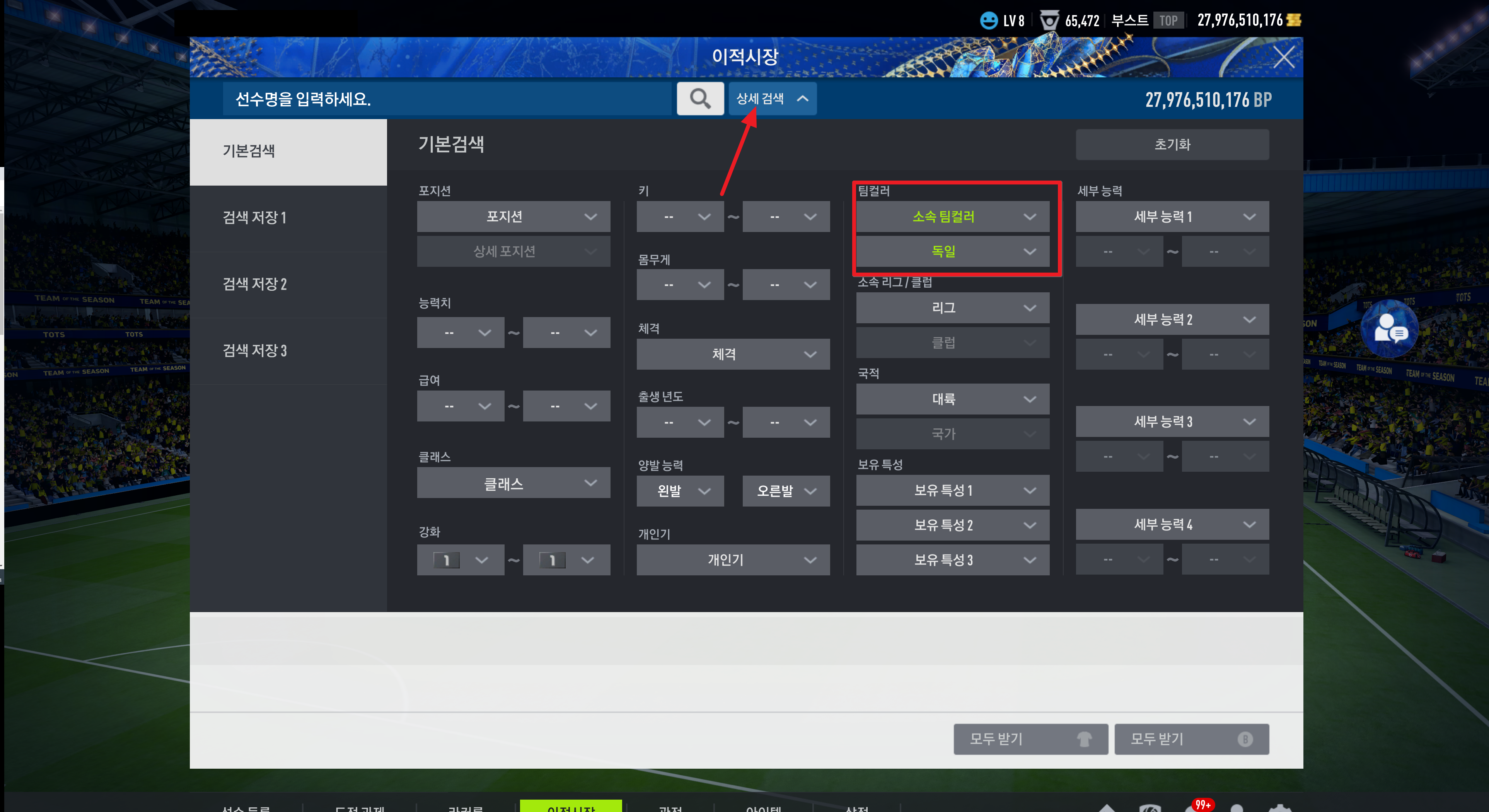 이적시장 상세 검색 메뉴에서 팀컬러 메뉴 중 소속 팀컬러 선택 후 독일을 선택해 값이 제일 저렴한 11명의 독일 선수를 영입했으며 240 급여를 맞추기 위해서 급여 부분도 15~20까지로 상세 검색을 하시면 편합니다.