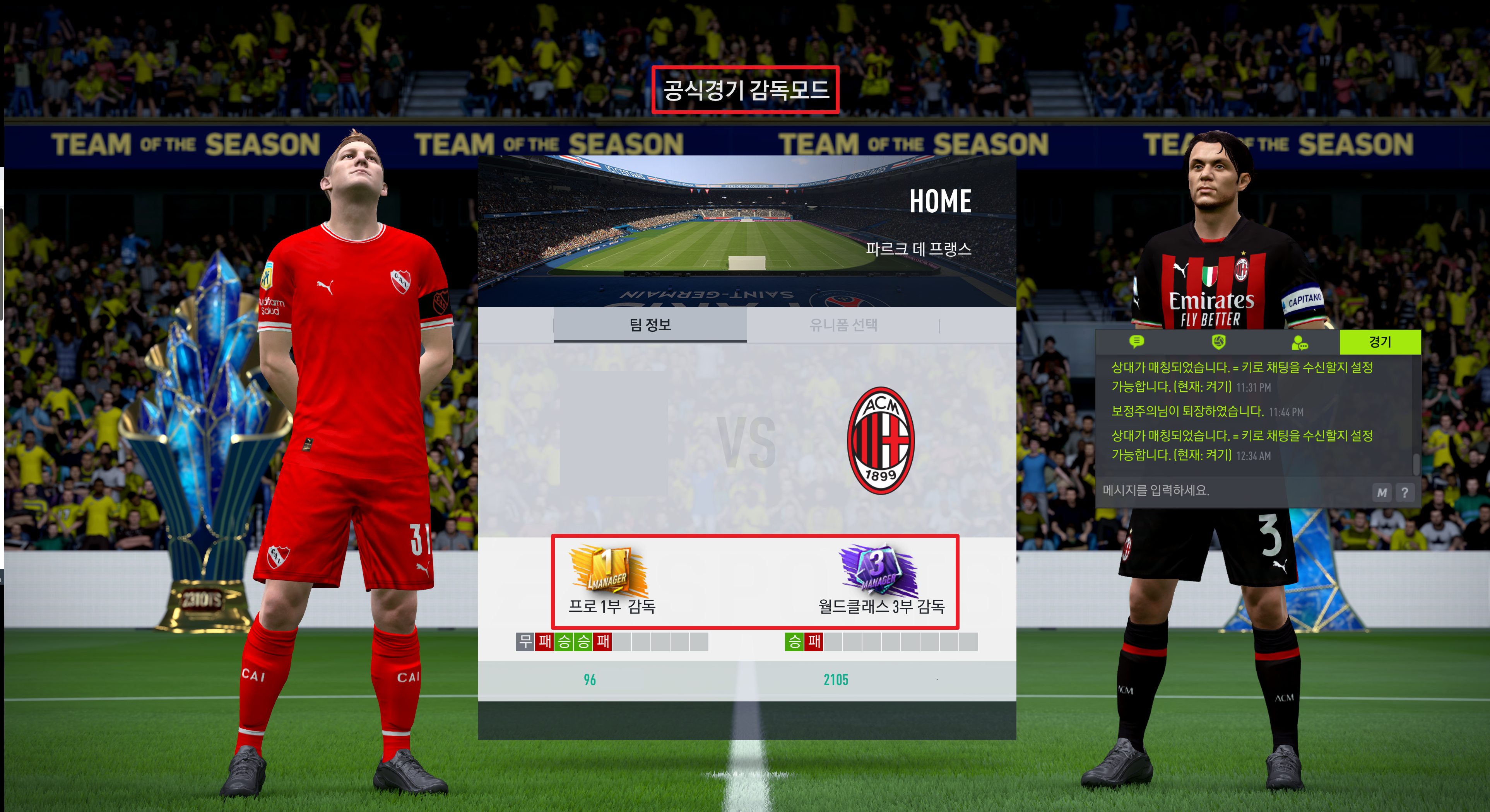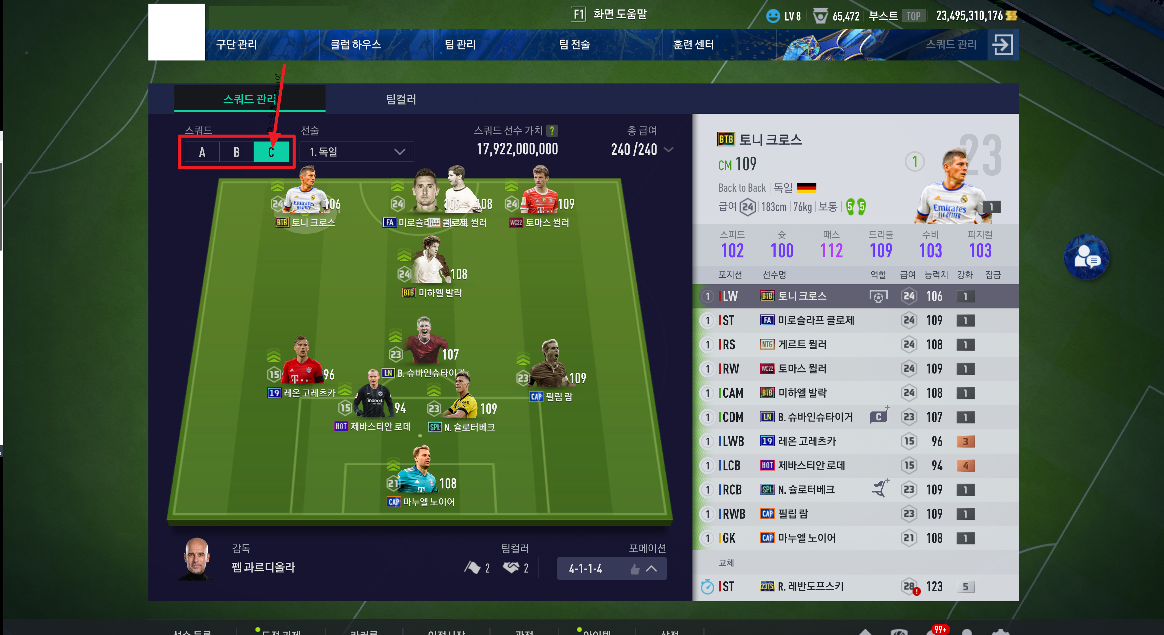 스쿼드 메뉴가 A, B, C로 나뉘어져 있는데 팀컬러용 스쿼드는 C에 저장하였고, 기존 스쿼드는 A에 저장했습니다. 직접 게임을 할 떈 스쿼드만 A로 바꾸고 팀컬러를 깨기 위해 감독 모드를 진행할 땐 스쿼드를 C로 바꾸기만 하면 되니 편했습니다.
