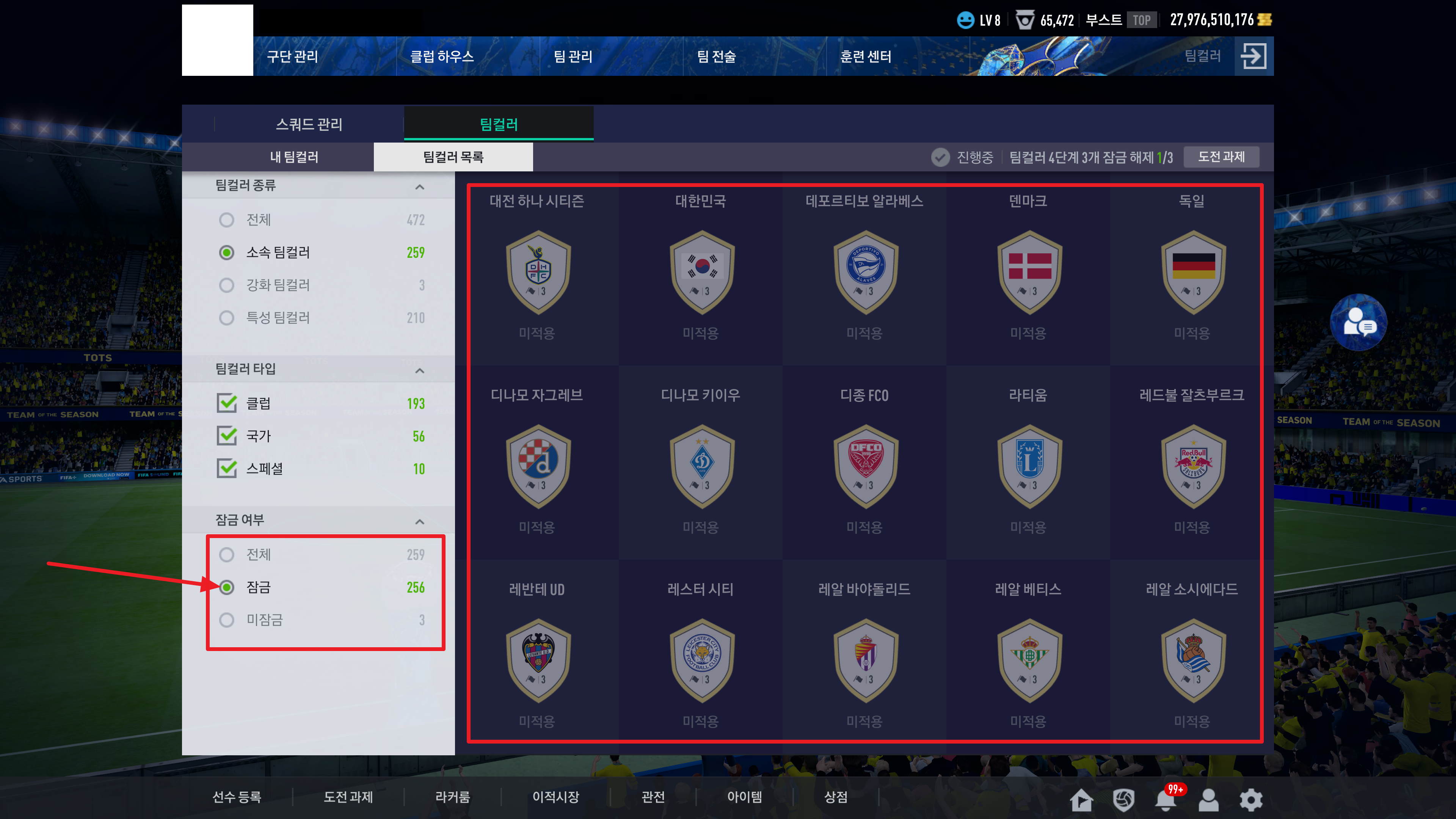 아래 이미지와 같이 잠금 메뉴를 선택하시면 현재 제가 깨지 못한 팀컬러 리스트가 나오게 됩니다. 여기서 독일을 선택해 자세히 확인해 보겠습니다.