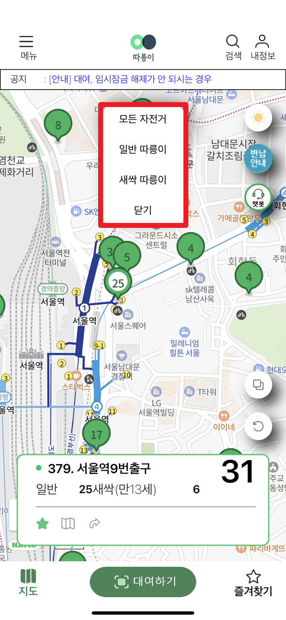 따릉이 앱 메인 화면에서 상단에 일반 따릉이라고 표시되어 있는 영역을 선택해 주시면 됩니다. 전 일반 따릉이로 선택되어 있는데 서울역 9번 출구 기준으로 지도엔 일반 따릉이가 25대 있다고 표시되어 있네요. 화살표 방향에 표시된 따릉이 종류 메뉴를 선택해 주세요.