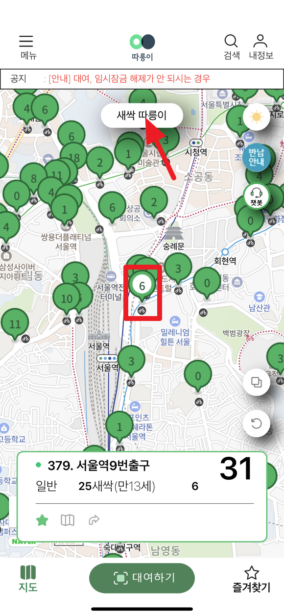 새싹 따릉이를 선택해 보시면 새싹 따릉이가 몇 대 있는지 표시됩니다. 같은 지역 기준으로 새싹 따릉이가 6대 있다고 표시되는 것으로 바꼈습니다.