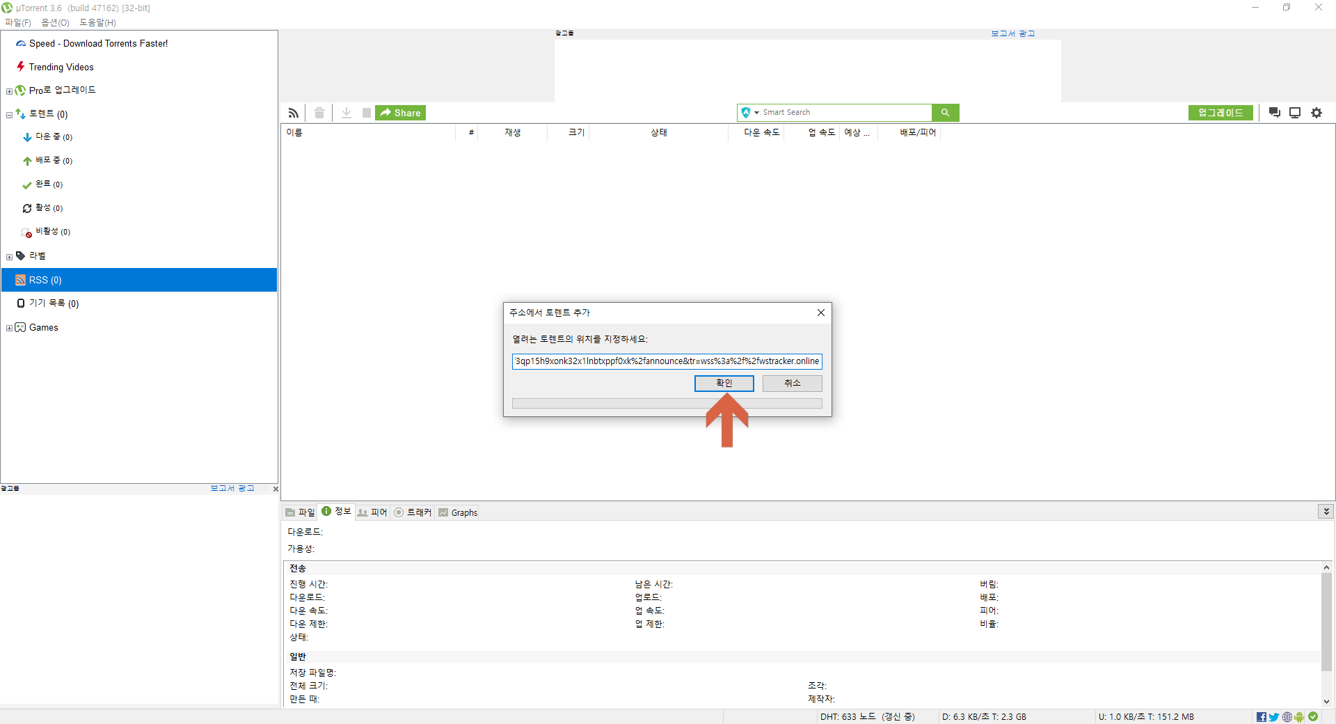 그리고 복사한 마그넷 주소를 복사해서 붙여 넣으시고 확인 버튼을 눌러 주시면 됩니다.