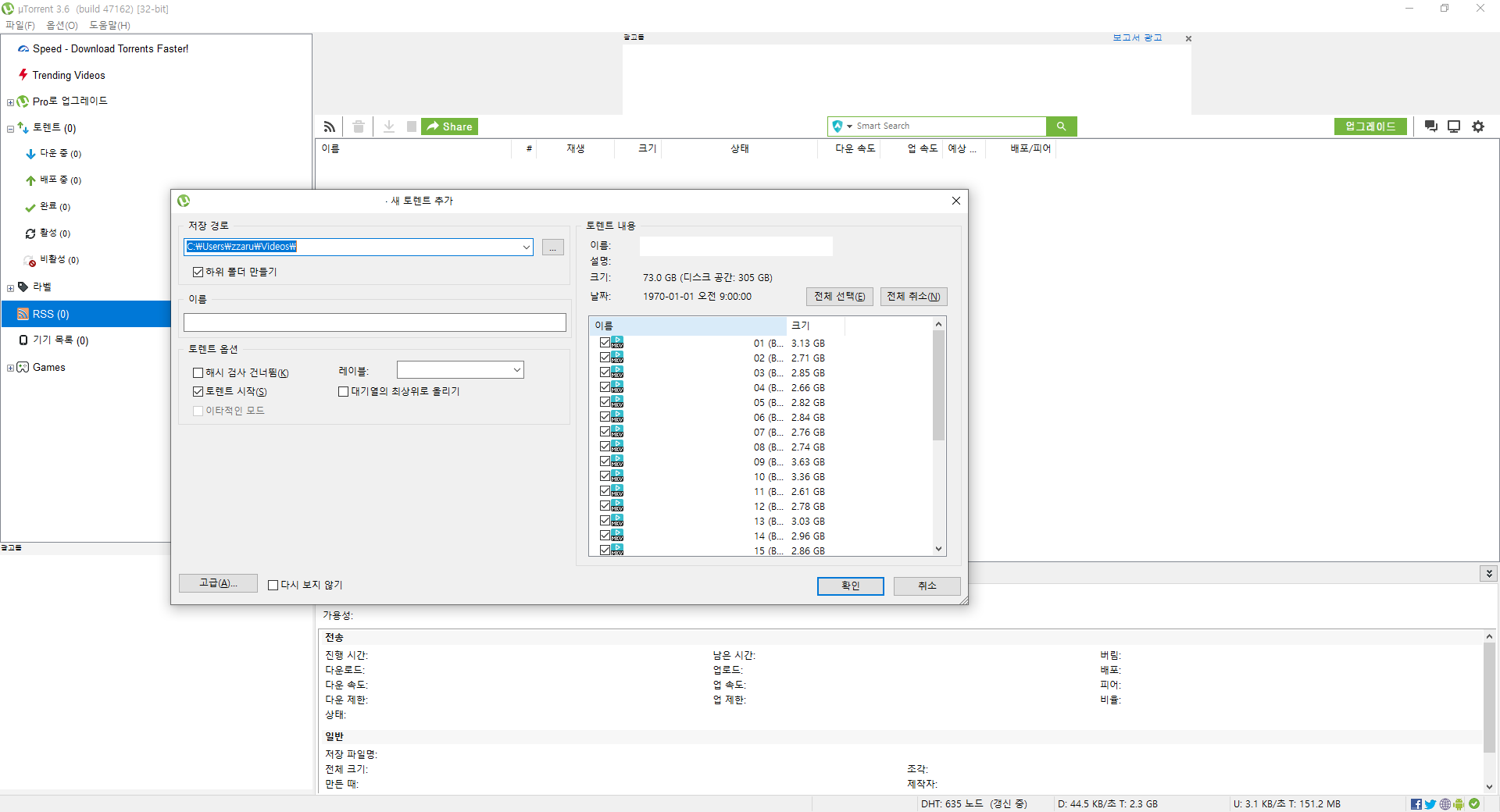 조금 기다리니 토렌트 파일 리스트가 표시되어 토렌트 프로그램에서 파일을 다운로드 할수 있었습니다.